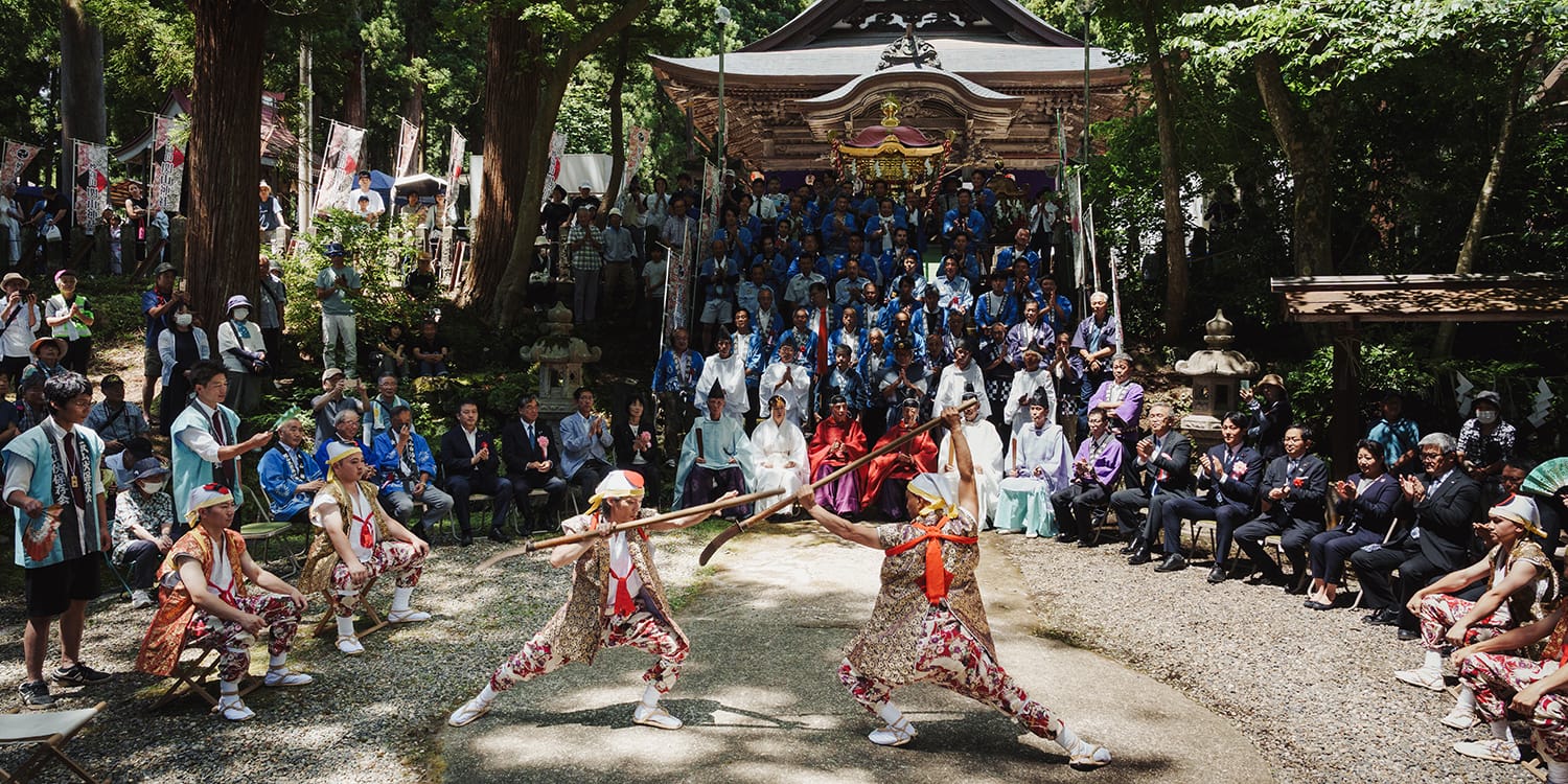 所作に身を委ねる関山神社にて、厳かな祈祷とともに体験は始まります。地域の限られた人々にのみ伝えられてきた祈りの演武を、継承者の導きのもと、自ら演じる稀有な時間です。